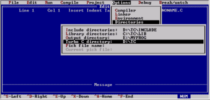 對(duì)目錄路徑的設(shè)置主要有包含文件的路徑,根據(jù)TC安裝的地方不同而有所區(qū)別。假設(shè)TC安裝在D:/TC,則應(yīng)將Include directories設(shè)置為D:/TC/INCLUDE,Library directories設(shè)置為D:/TC/LIB,Trubo C directory設(shè)置為D:/TC,如果你的TC安裝在C:/TC,則只需要將前面的路徑改為C:/TC即可。Output directory是編譯后的輸出代碼文件的目錄,在編譯過程中會(huì)產(chǎn)生.OBJ和.EXE文件,此目錄存放的是這些文件的目錄。3. TC2.0的菜單功能介紹