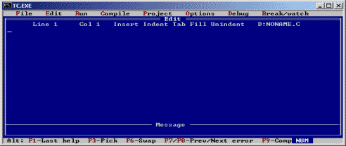如果操作系統(tǒng)處于windows環(huán)境下,有兩種方法可以啟動(dòng)TC。一是在windows環(huán)境下進(jìn)入DOS狀態(tài),在啟動(dòng)->運(yùn)行中輸入command或cmd, 進(jìn)入到DOS屏幕,然后進(jìn)入到TC的相應(yīng)子目錄,運(yùn)行TC.EXE。另一種方式是為TC.EXE創(chuàng)建一個(gè)快捷鍵,通過”資源管理器”找到TC.EXE運(yùn)行文件,點(diǎn)擊右鍵,創(chuàng)建快捷方式,然后將快捷方式復(fù)制到桌面,可通過快方式快速啟動(dòng)TC。進(jìn)入Tc,您可以看到類似上面這樣的屏幕。主窗口主要分為菜單行、編輯狀態(tài)信息行、編輯窗口、消息窗口和常用命令提示行等五部分。如下圖所示: