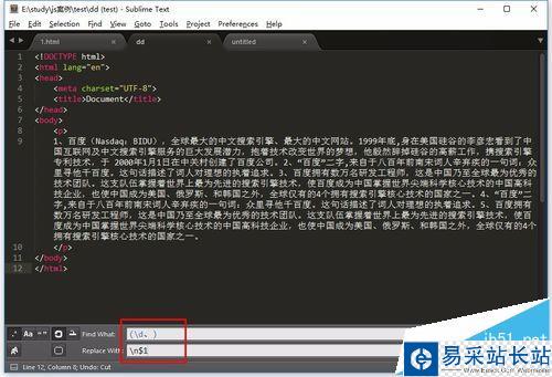 4、輸入相關(guān)正則表達(dá)式;例如小編在查找欄輸入“(/d、)”,意思是找到數(shù)字和頓號(、)組合,然后在替換欄輸入“/n$1”(意思是替換成分行和原先的數(shù)字頓號組合),再點擊右邊的“replace all”按鈕;