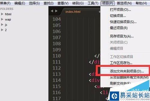 1、sublime如何新建工程、項目的。第一可以直接把一個或者多個工程拖到左側FOLDERS文件夾管理界面;第二可以打開:項目->添加文件夾到項目。