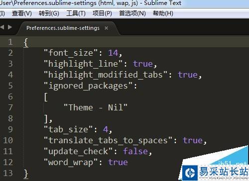 3、sublime實用的配置。打開:首選項>設置-用戶,然后可以在里面設置字體大小"font_size": 14;關閉檢測更新"update_check": false,自動換行"word_wrap": true等。