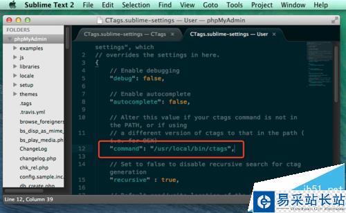把default中的配置全部復制到user中,然后改一下command配置項,為ctags的可執行文件路徑/usr/local/bin/ctags