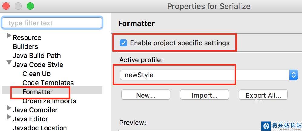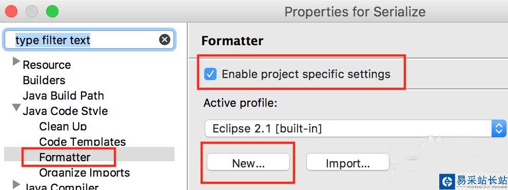 3、啟用自定義的自動化排版樣式。點擊左側(cè)選擇欄的"Java Code Style(Java代碼風(fēng)格)"->"Formatter(排版)",看到右側(cè)的頁面。然后,勾選"Enable Project Specific Settings(啟用工程配置)"選項,再點擊"new(新建)"按鈕,來設(shè)置自定義的代碼風(fēng)格。
