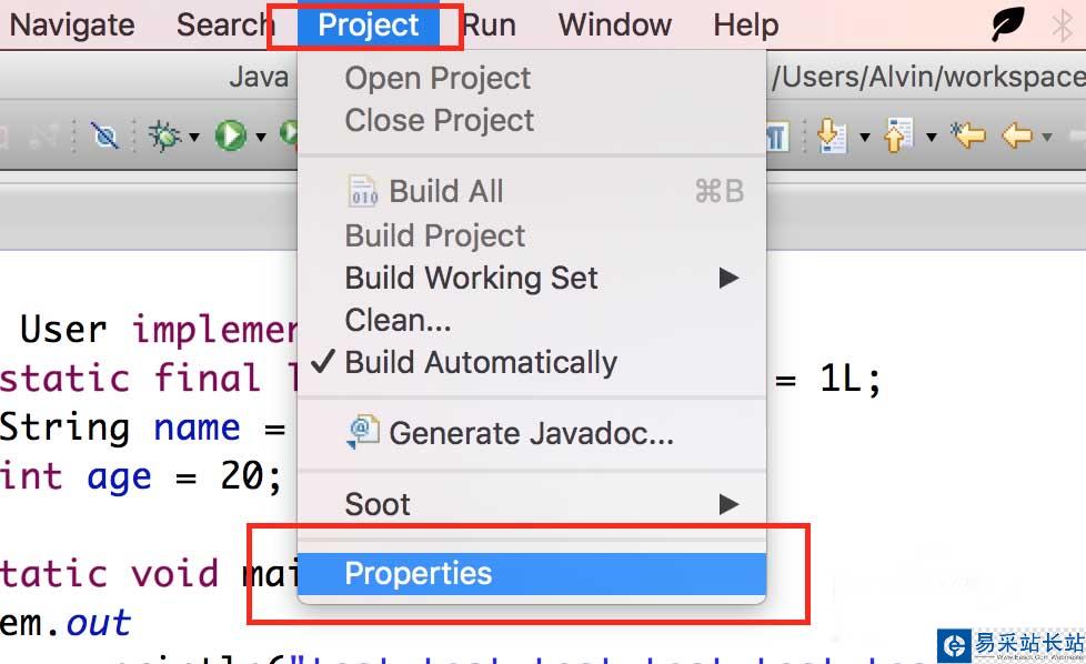 2、進(jìn)入工程屬性設(shè)置頁面。點擊菜單上的"Project(工程)"->"Properties(屬性)",進(jìn)入工程屬性的設(shè)置頁面