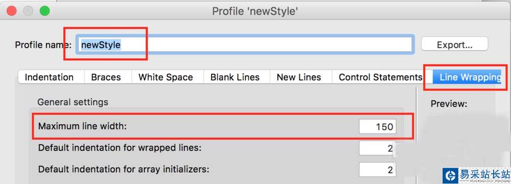 5、設(shè)置行寬的最大值。點擊右上角附近的"Line Wrapping(行截斷)"標(biāo)簽頁,在"General Settings(通用設(shè)置)"下設(shè)置"Maximum line width(最大行寬)"的值,從默認(rèn)值80改成150,保存設(shè)置。