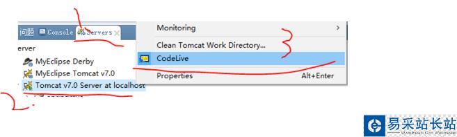 2、在Servers視圖中找到運行的服務器類型(我的是Tomcart7.0),右鍵選擇CodeLive并單擊。問題解決。。。