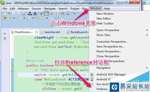 1、首先,是設(shè)置背景色的方式,打開(kāi)Eclipse以后,依次點(diǎn)擊 Windows -> Preference。打開(kāi)界面配置對(duì)話(huà)框。操作如圖所示