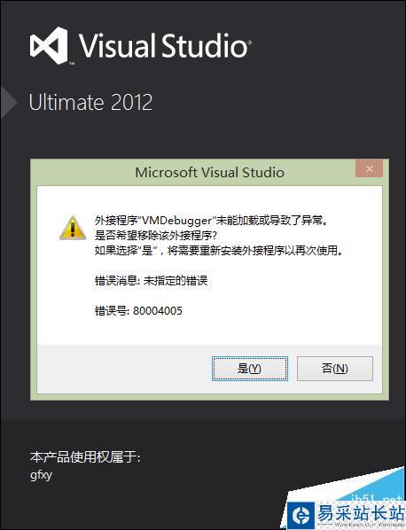 在vs2012啟動時,有時會出現以下愛錯誤:外接程序”VMDebugger”能加載或導致了異常,是否希望移除該外接程序?對于該警告,我們可以點擊是或否,關閉警告對話框,忽略警告,不過在下一次啟動vs2012時,還是會彈出警告對話框的。既然如此,那我們要如何處理該警告使其在啟動vs2012時不再彈出警告對話框呢?