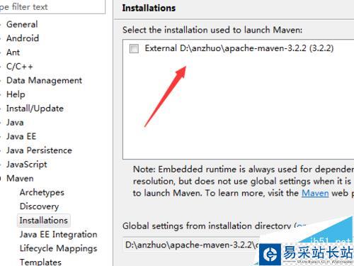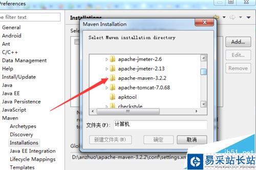 3、在左側(cè)的列表中選中為maven的選項,進行點擊installations的選項,進行選中為add的添加。