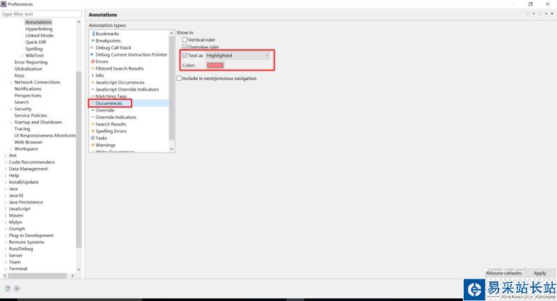 2、在【Preferences】窗體中依次點(diǎn)擊【General】——【Editors】——【Text Editors】——【Annotations】,顯示右側(cè)的【Annotations】區(qū)域。在Annotation types中選擇【Occurrences】,然后在右側(cè)的【Color】中可以設(shè)置一個(gè)顏色,并且將【Text as】設(shè)置為Highlighted,最后點(diǎn)擊【Apply】按鈕,即可使設(shè)置生效。