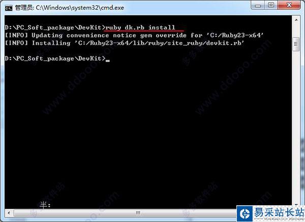 5.接下來在DevKit的安裝目錄中,輸入“ruby dk.rb install”,如下圖所示。