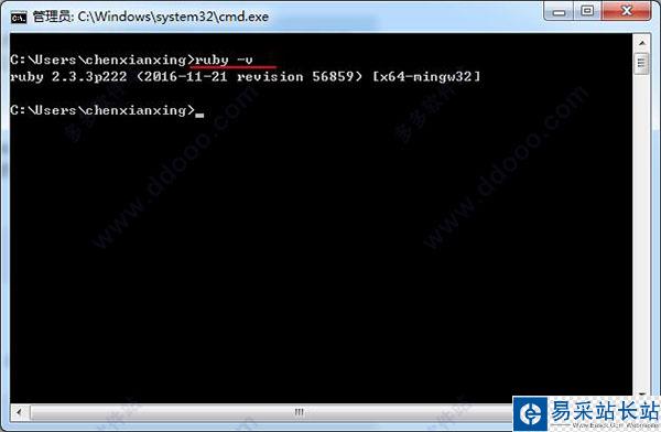 3.安裝完畢之后,打開cmd輸入"ruby -v"(不帶引號),將會出現ruby的版本,如下圖所示。