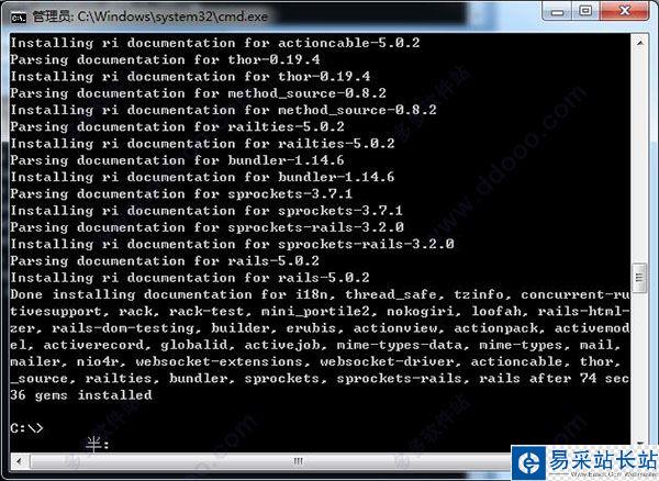 6.之后再cmd中輸入“gem install rails”開始安裝rails。此過程大約花費30分鐘左右,具體時間與機器配置有關,請耐心等待,如下圖所示。