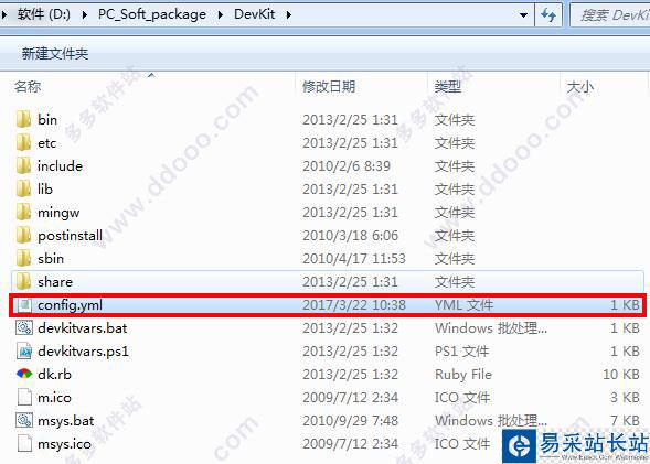 4.接下來運行下載的解壓文件中的“DevKit-mingw64-64-4.7.2-20130224-1432-sfx.exe”,安裝DevKit,小編將它安裝在了“D:/PC_Soft_package/DevKit”文件中,之后在cmd中進入DevKit的安裝目錄,執行ruby dk.rb init命令。最后修改config.yml文件(該文件位于DevKit安裝目錄中),將文件中的 C:/Ruby22-x64 修改為你的Ruby安裝目錄,如下2圖所示。