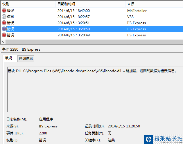 問題焦點已經很清楚了,就是IIS Express未能啟動。于是想到查看事件,看有沒有記錄更具體的日志。
