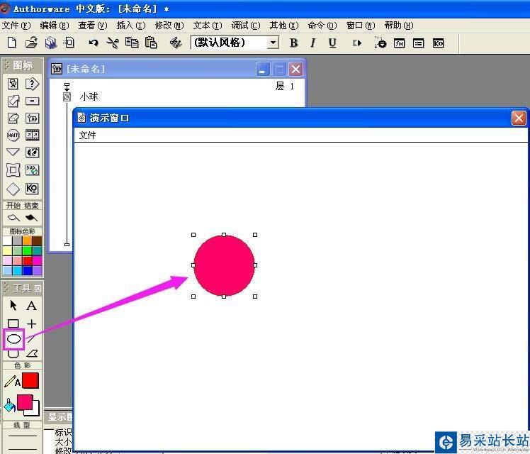 3、雙擊小球圖標(biāo),選擇左邊的橢圓繪制工具,在空白的演示窗口畫(huà)一個(gè)紅色的小球;