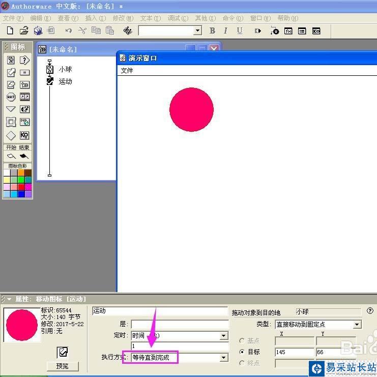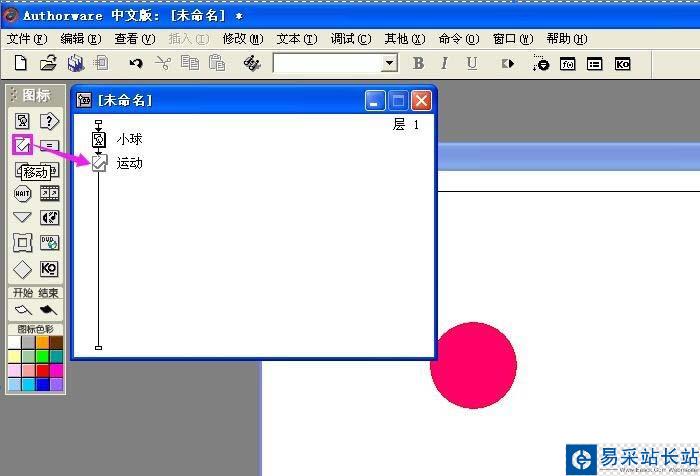 4、拉一個(gè)移動(dòng)圖標(biāo)到小球的下面,命名為運(yùn)動(dòng);