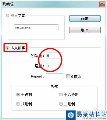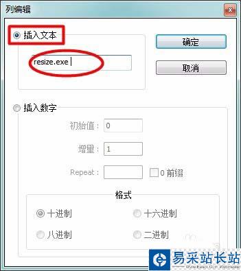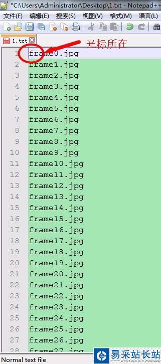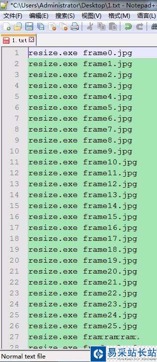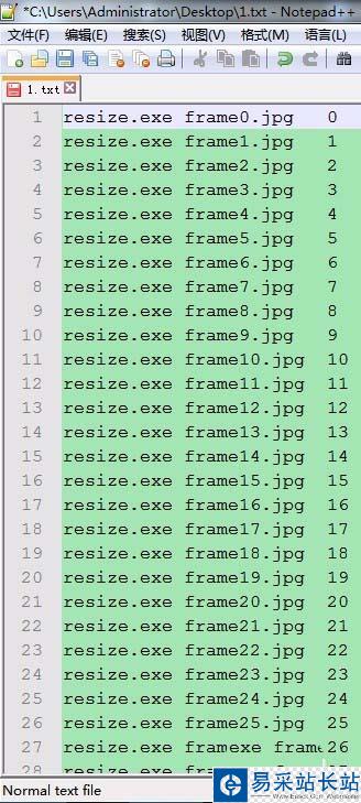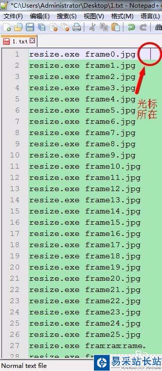 3、如果想往每一個文件名前加上字符串 “resize.exe”,一行一行去加顯然是耗費精力的,這時就需要用到列塊編輯了。首先將光標定位到要插入字符串的第一個位置處,如圖