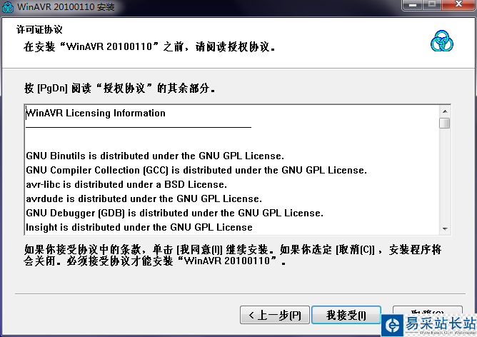 WinAVR在GNU GPL許可協(xié)議下發(fā)布。接受許可協(xié)議,以繼續(xù)安裝。
