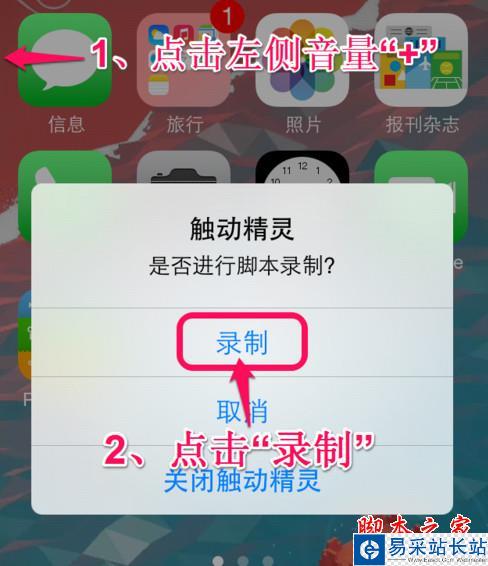 1、首先我們要運行觸動精靈工具,然后回到主菜單,只要點擊設(shè)備的【音量+】鍵,就可以彈出一個菜單,再次點擊【錄制】就會開始錄制腳本了;