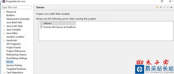 (2)在項目上右鍵Properties 選擇Server 發現當前選擇的服務器為<None>,選擇下面的Tomcat v8.0 Server at localhost