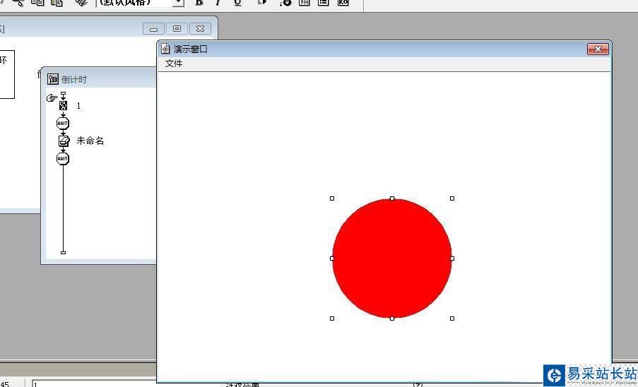 4、雙擊【倒計時】流程線上的顯示圖標,在演示窗口中用橢圓工具繪制一個圓,然后用紅色進行填充,并在屬性欄中將特效設置為【激光展示2】