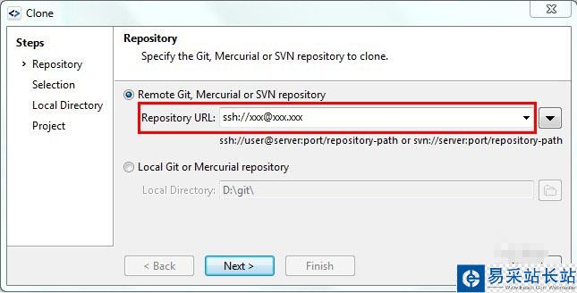 2、然后彈出對話框,先填寫Repository URL。然后Next。