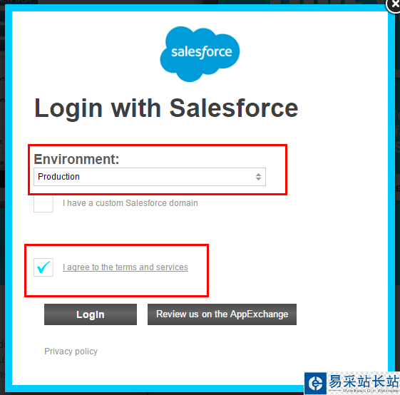 3、不是在salesforce中安裝,而是跳到一個新的頁面,使用salesforce賬號登陸,選擇環境,勾選同意