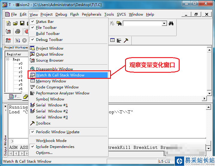 第二步:調(diào)出觀察窗口(用來設(shè)置要觀察變量的設(shè)置窗口);點(diǎn)擊“View”→"Watch&Call Stack Window"。如下圖操所示: