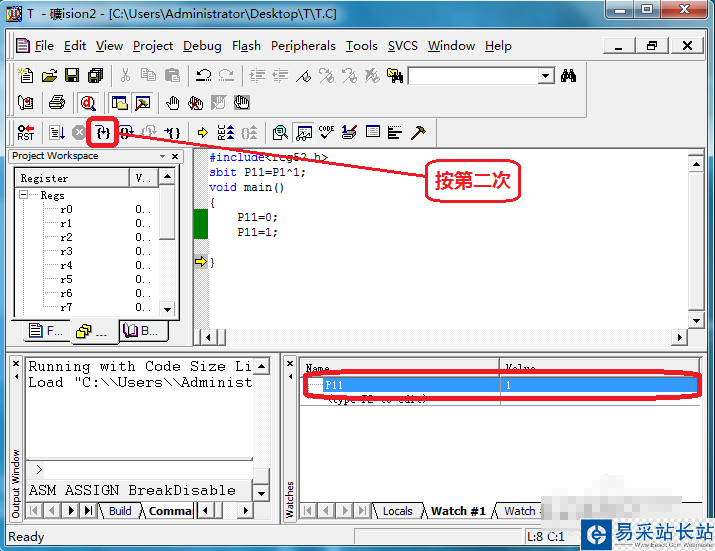 第六步:再一次點(diǎn)擊”單步調(diào)試“按鈕。同時(shí)觀察”Watch“窗口P11變量的變化情況。如下圖所示: