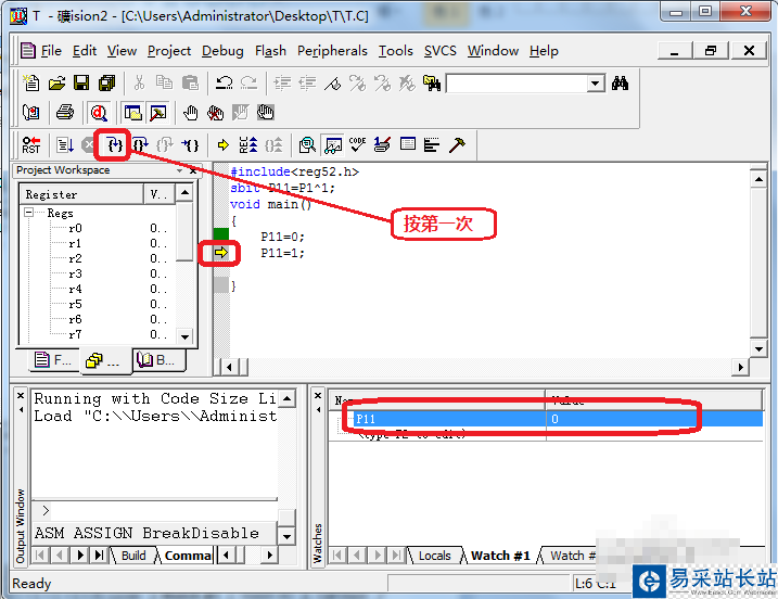 第五步:點(diǎn)擊”單步調(diào)試“按鈕,點(diǎn)擊一次,同時(shí)觀察”Watch“窗口P11變量的變化情況。如下圖所示:
