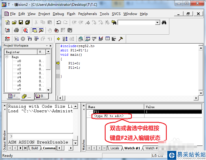 第四步:在彈出的”Watch“窗口中設(shè)置要要觀察的變量,點(diǎn)擊”Watch#1“→雙擊"type F2 to edit"→輸入要觀察的變量名,在這里我要觀察的是P11,具體操作如下: