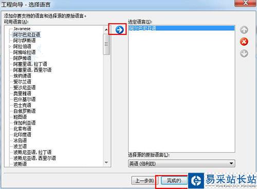 7、接下來要選擇一下本地化所需要用到的語言,比如我們要漢化程序,即選擇簡體中文,然后點擊上面的藍色箭頭,將此語言移動到選定語言欄中。然后再選擇程序的原始語言,就在右下角的選擇設置中;