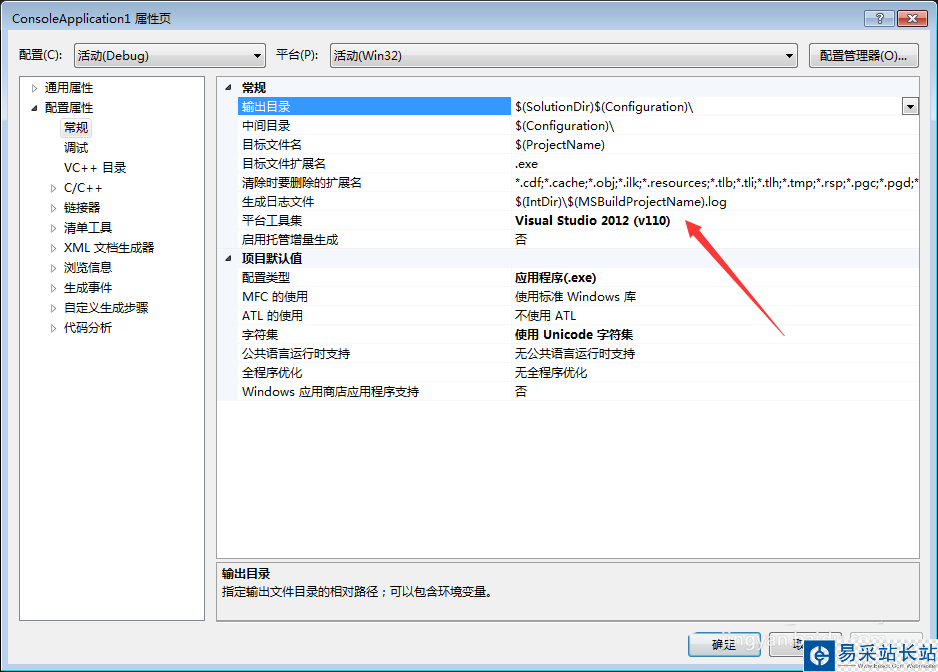5、找到平臺工具集,會發(fā)現(xiàn)后邊就是Visual Studio的版本,需要升級的時候會有一個下拉三角形,點擊三角形選擇對應(yīng)的版本,然后點擊確定即可。