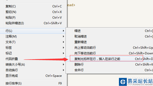 5、選中行之后,彈出了下一級(jí)菜單匯總,進(jìn)行選中為“復(fù)制光標(biāo)所在行,插入在該行之前”的選項(xiàng)。