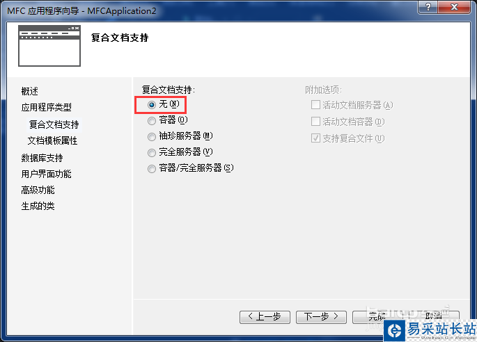 6、復合文檔。主要就是是否需要容器和服務器,一般程序不需要,選擇“無”,點擊下一步