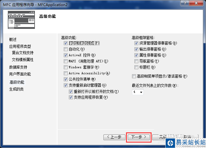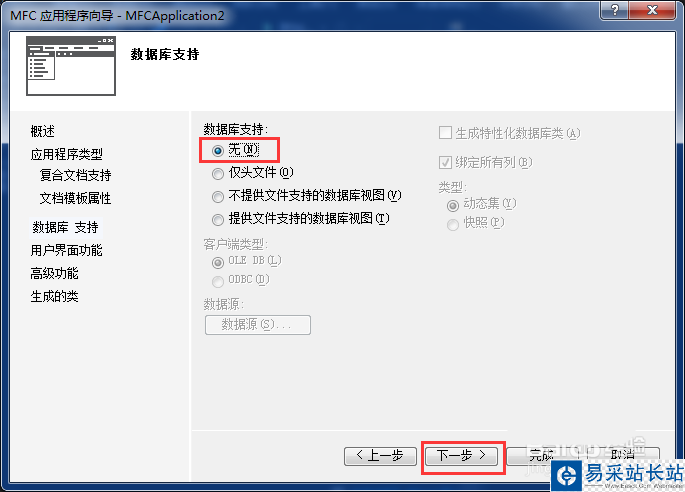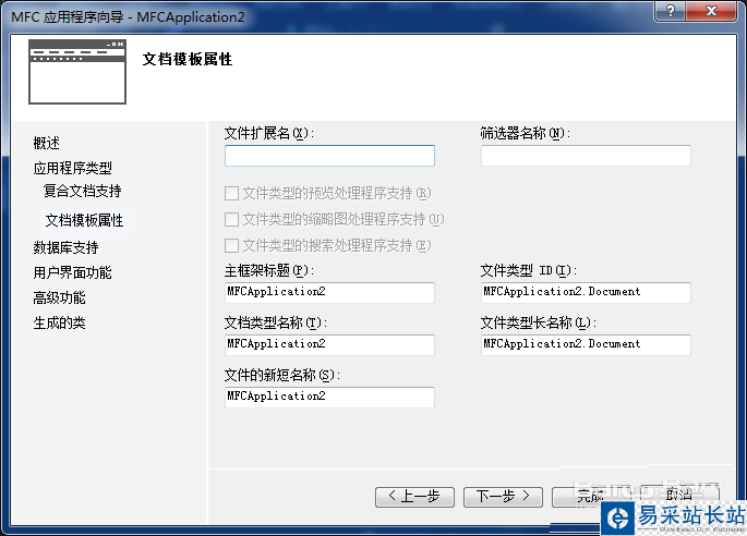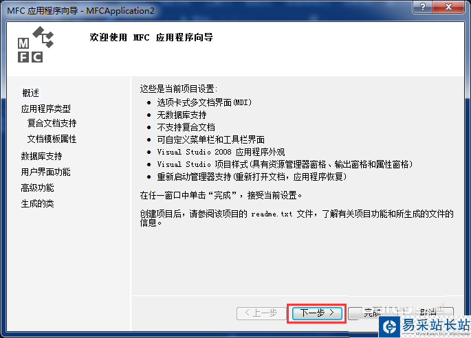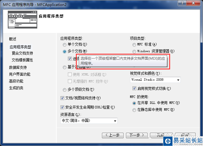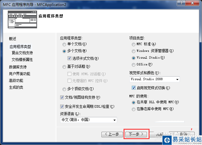 5、這個界面一般主要就是選擇應用程序類型,多文檔的是最全的,設計相對也復雜點。對話框的話,結(jié)構(gòu)有些功能是用不了的。之前就吃過虧,對話框的有些功能怎么也使用不了。