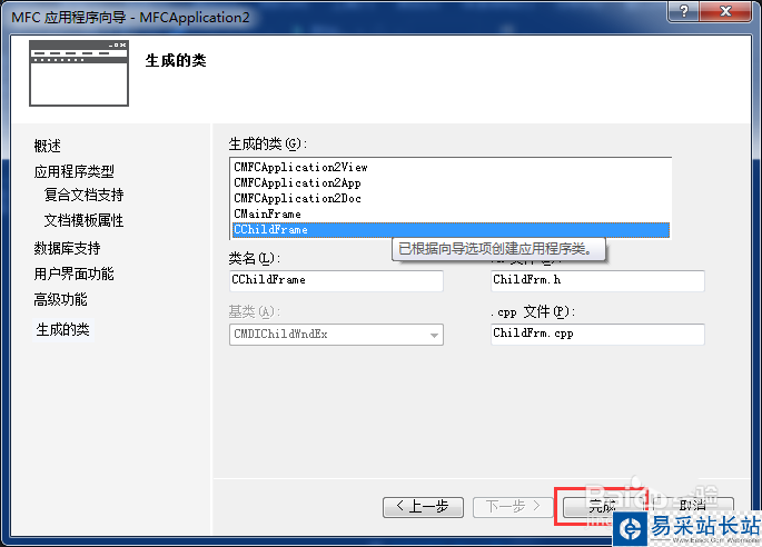 11、最后,系統(tǒng)就會根據(jù)配置,生成代碼,對應代碼的類結(jié)構(gòu)如圖。點擊“完成”一個MFC的程序就完成了。