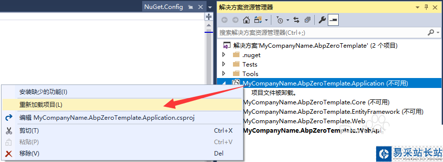1、在“不可用”的資源上點擊右鍵,選擇“重新加載項目”。這時,VS就會重新讀取資源,修正錯誤的資源引用。然后,人為依次將各個“不可用”資源修正。