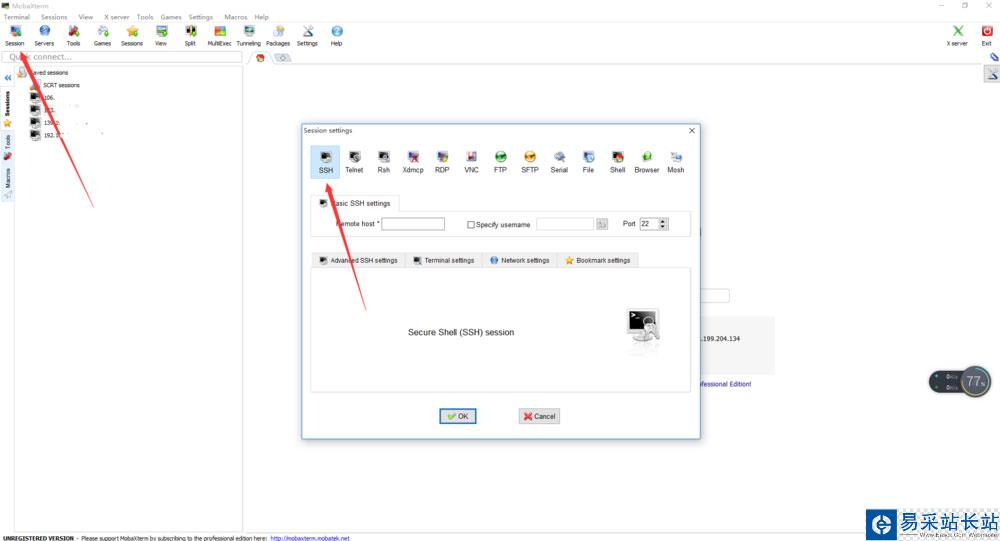 點擊左上角的Session新建一個會話,在會話對話框中點擊SSH,切換到SSH參數頁。remote host填寫遠端服務器的地址,Specify username填寫用戶名,port填寫端口,點擊OK就可以登錄到遠端服務器了。