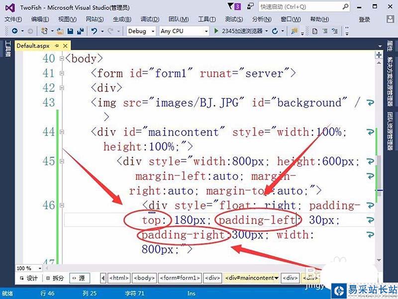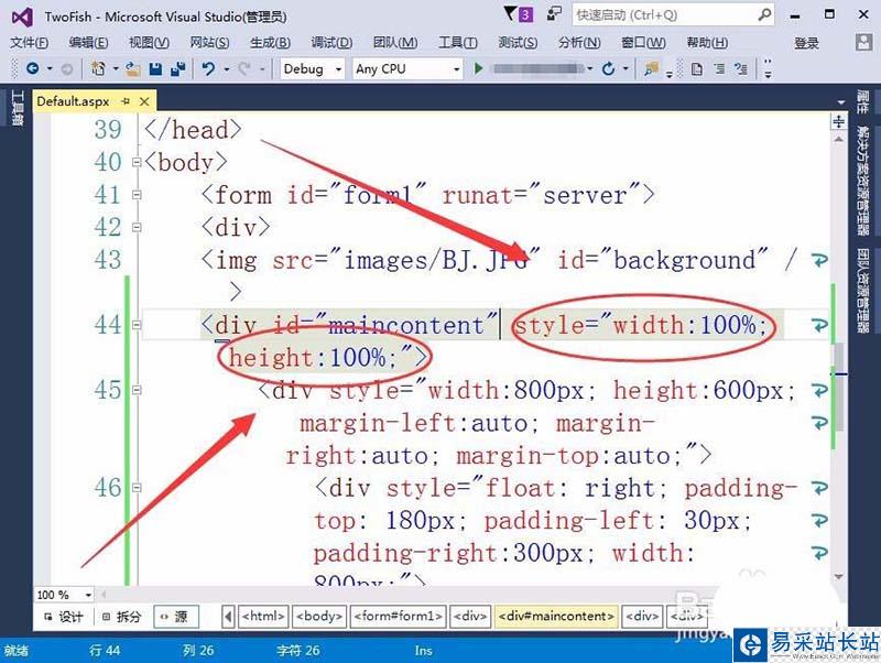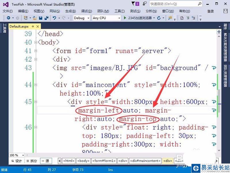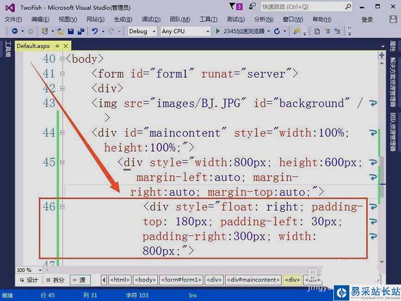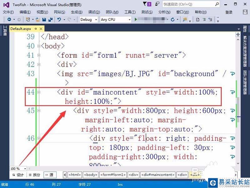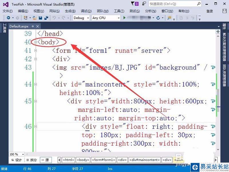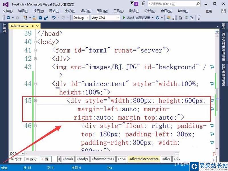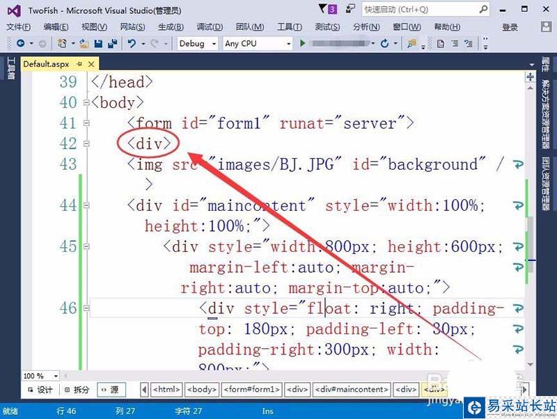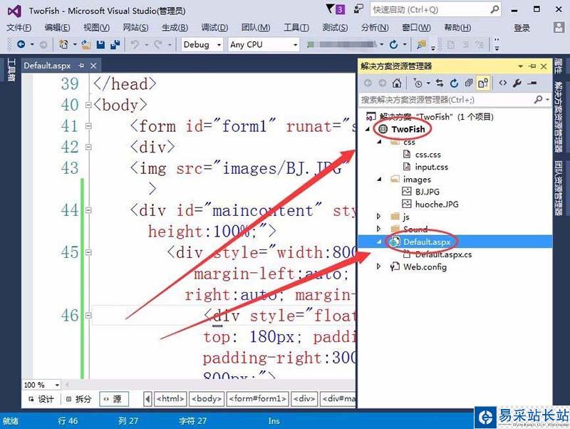 1、打開一個已有的Visual Studio作品,本例為TwoFish網站,網頁文件為Default.aspx。