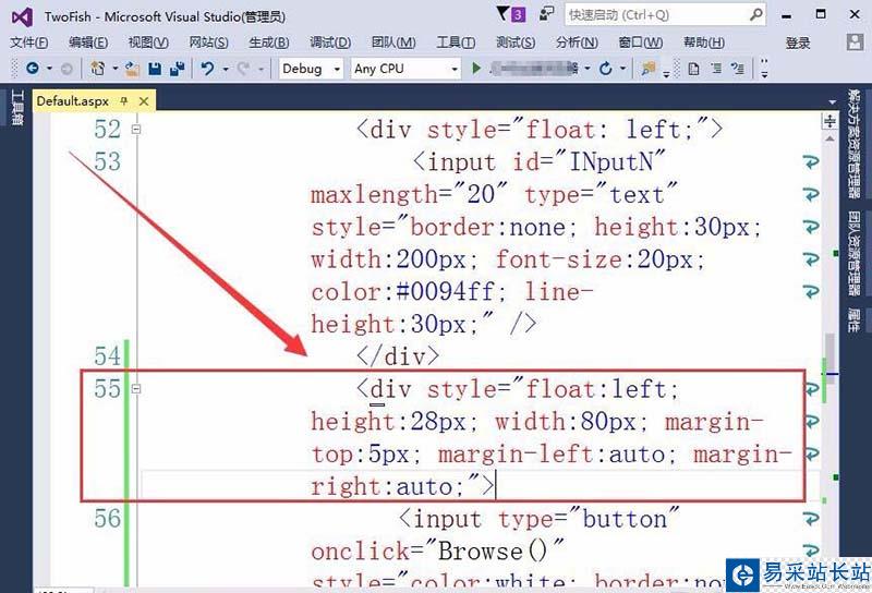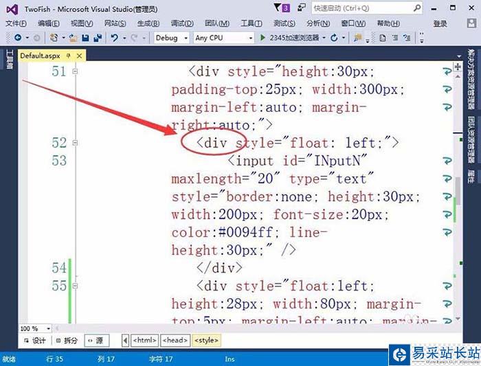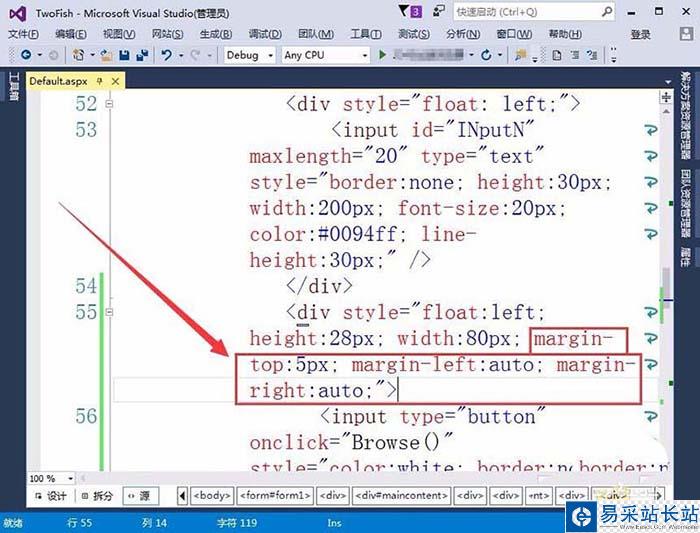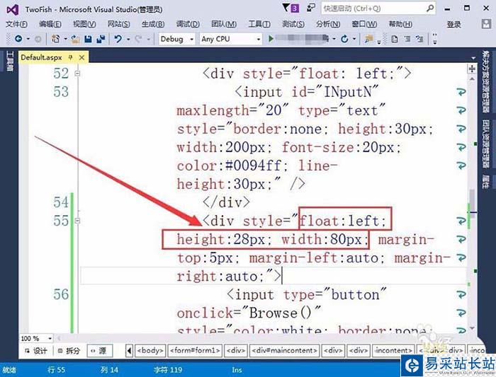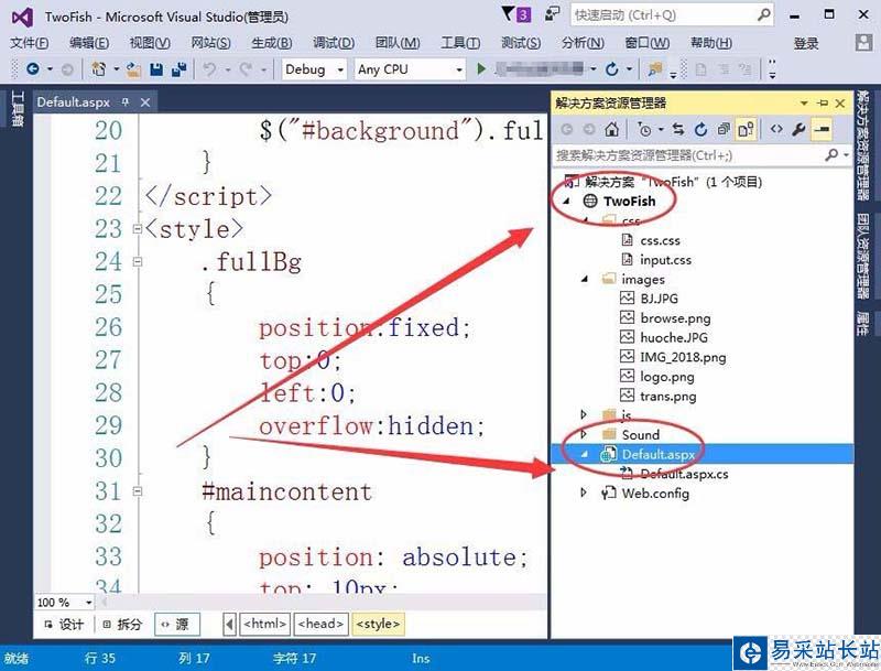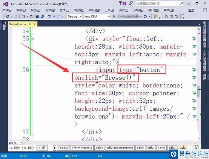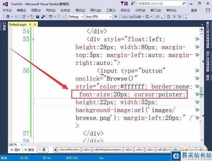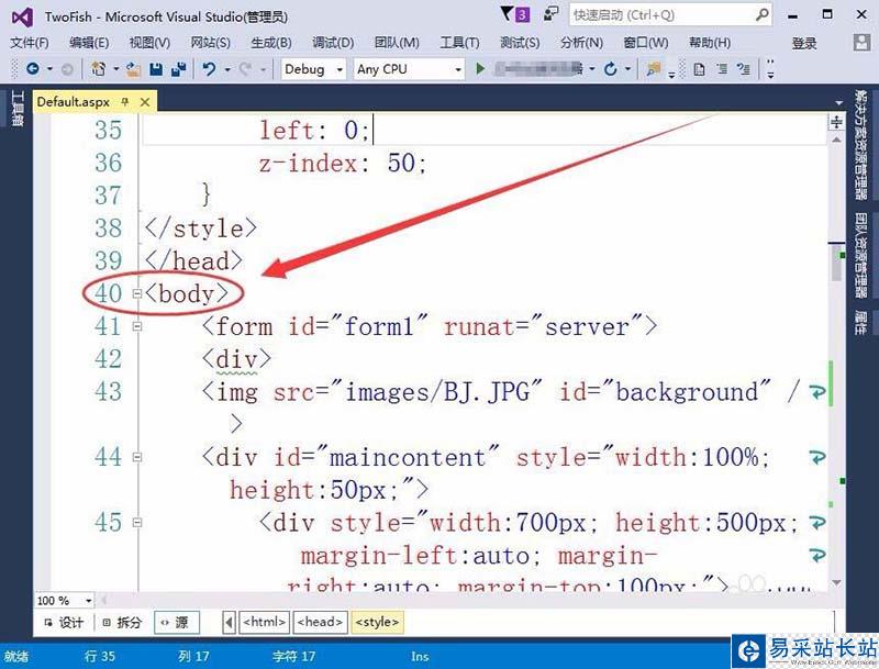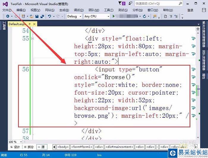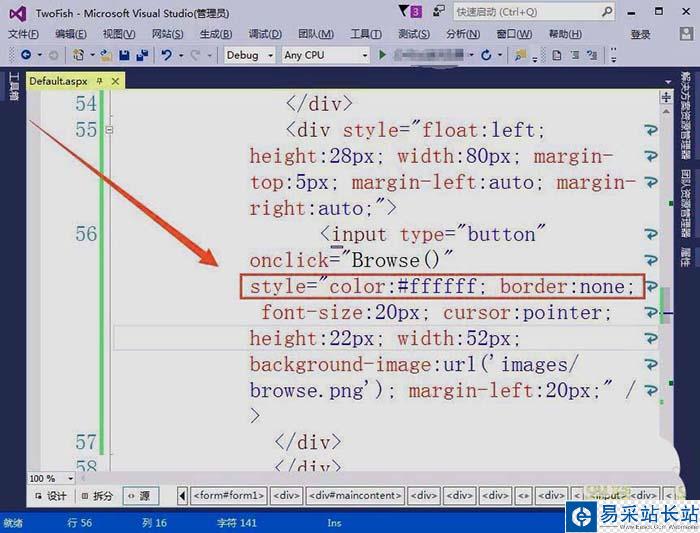 1、打開Visual Studio,創建一個網站,并打開它的首頁Default.aspx。
