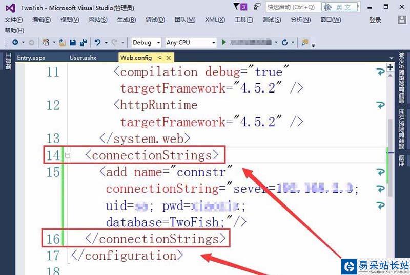 4、首先,輸入connectionStrings標簽,用來輸入配置數據庫連接的代碼。