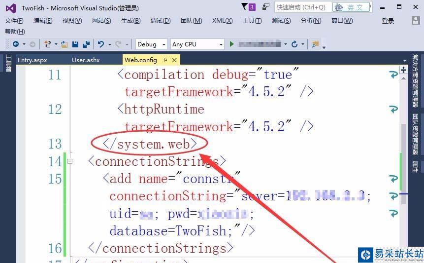3、在左側代碼窗口中,找到system.web標簽,如下圖所示。