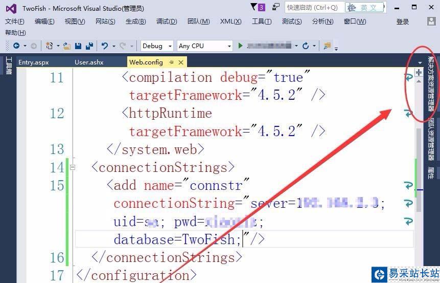 1、用Visual Studio打開一個已有的網站,單擊右側的解決方案資源管理器選項。