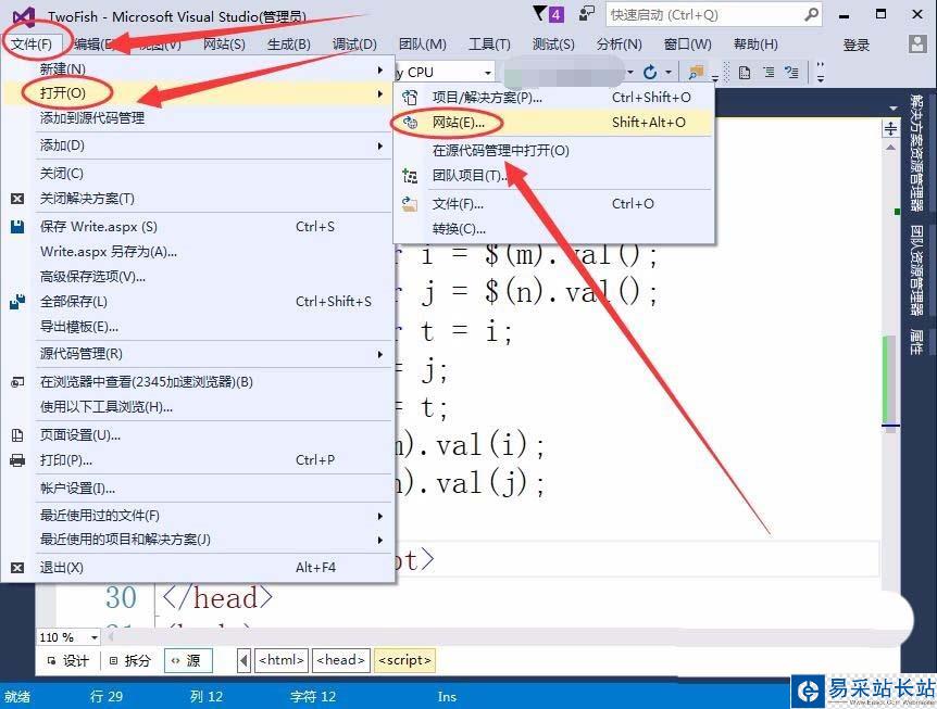 1、打開Visual Studio后,選擇文件---->打開---->網(wǎng)站,打開一個(gè)已有的網(wǎng)站,本例為TwoFish。