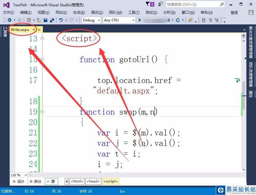 2、在Write.aspx網(wǎng)頁中,在script標(biāo)簽下輸入函數(shù)。