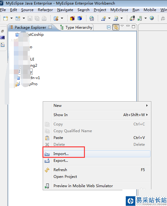 3、在打開的myeclipse左側空白處點擊右鍵,找到Import選項