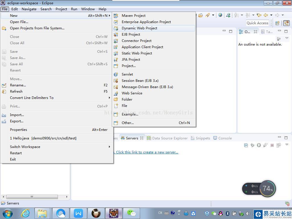 a) 打開后在工具欄依次點擊【File】>>>【New】>>>【Dynamic Web Project】,這個就代表新建的項目是WEB項目