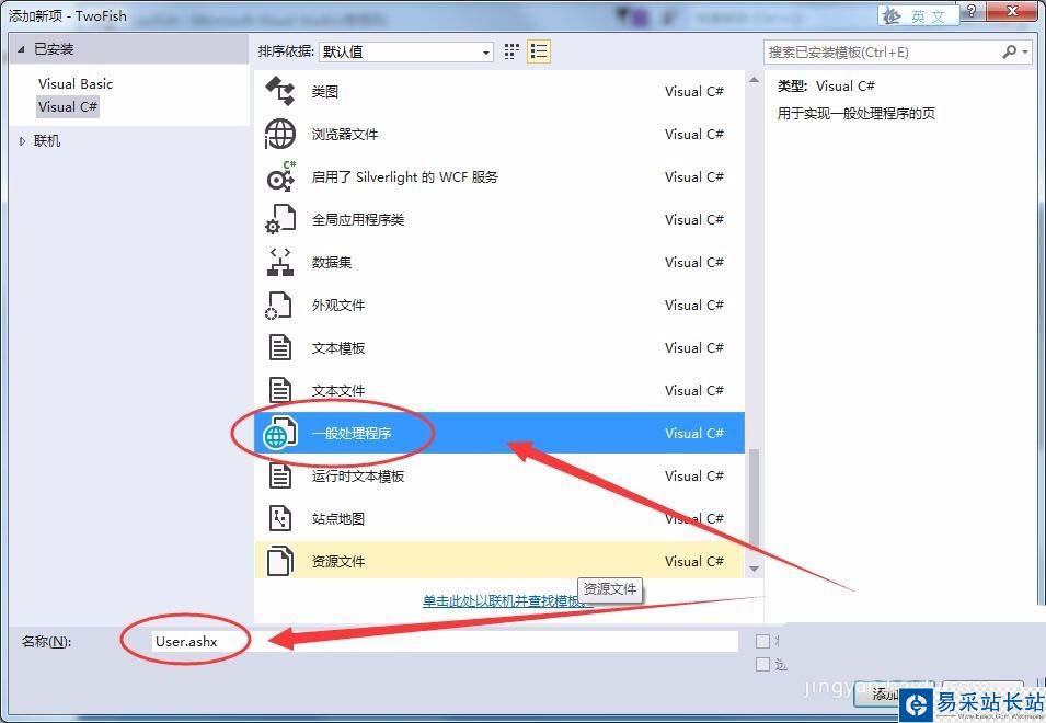 5、列表中選擇一般處理程序選項,將名稱改為User.ashx,單擊添加。